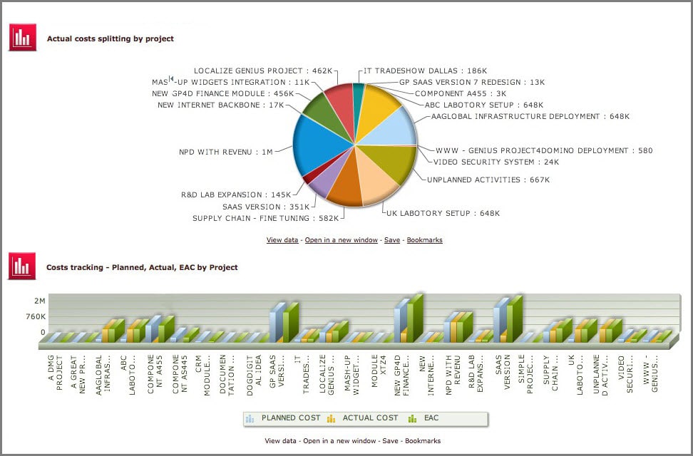 Access 100% configurable project dashboards containing only the views or graphics you want, or a combination of both and make them available to other users. Choose from a collection of predefined dashboards or create and store your own. Easily create or customise project charts including drill down capabilities, whether a trend line, scatter chart, bubble charts, pie chart or other.