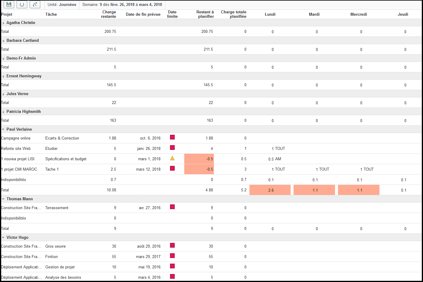 Planifiez précisément quand (quels jours) chaque ressource devra travailler sur ses tâches en tenant compte des affectations existantes de la ressource, de ses indisponibilités personnelles, des jours fériés et des week-ends.
