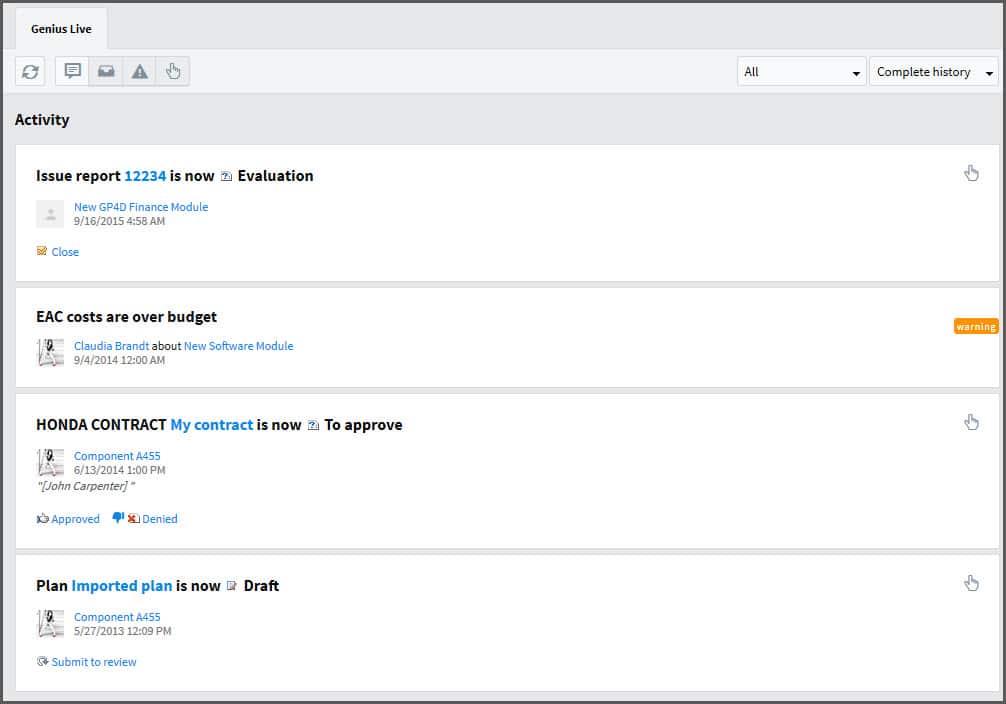 Bénéficiez d’une plateforme de collaboration intégrée qui exploite le meilleur de la collaboration d’équipe et des médias sociaux. Améliorez la collaboration entre les équipes afin de faciliter le flux d’informations sur les projets, d’accroître la productivité des équipes de projet et de faciliter l’adoption par les utilisateurs. Permettez aux membres de l’équipe de capturer des discussions en fil de discussion tout au long du cycle de vie des projets, de soumettre des commentaires et de répondre aux questions des parties prenantes et des autres membres de l’équipe ; choisissez de mettre ces discussions à la disposition de l’ensemble de l’équipe à des fins de documentation et de retour d’information.