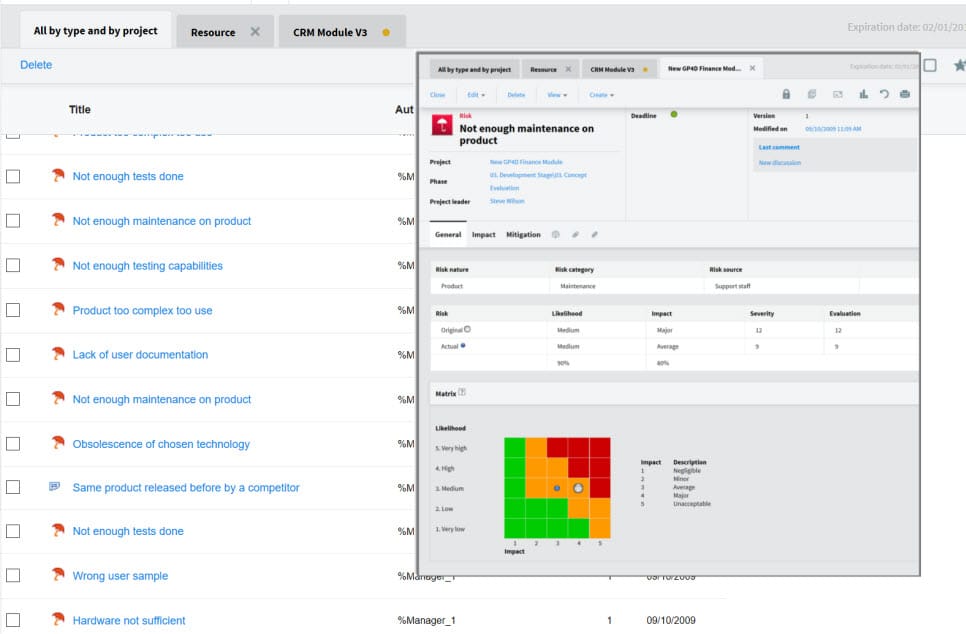 Augmentez vos chances de réussite du projet grâce aux capacités de gestion des risques de Cerri Project qui permettent aux membres de l’équipe de contribuer au registre des risques du projet, d’identifier la gravité du risque, de mener une analyse complète du risque et de discuter des moyens d’atténuer le risque.