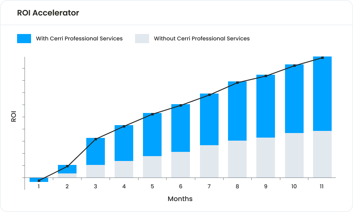 Obtenez une meilleure productivité et des niveaux de soutien commercial plus rapides et plus efficaces grâce aux programmes de services professionnels de Cerri. Vous constaterez une amélioration de 80 à 300 % dans la réalisation de vos projets en utilisant Cerri Project, et jusqu’à plus de 500 % en travaillant avec nos consultants professionnels.