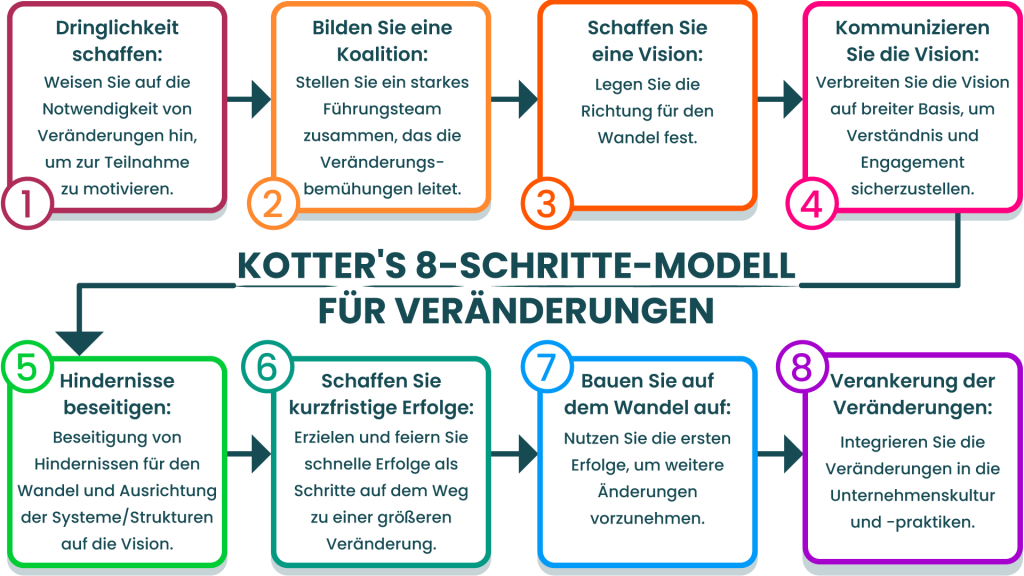 Dieses Modell, das von John Kotter entwickelt wurde, bietet einen strukturierten Ansatz für das Änderungsmanagement. Es umfasst Schritte wie die Schaffung eines Gefühls der Dringlichkeit, den Aufbau einer führenden Koalition und die Verankerung von Veränderungen in der Unternehmenskultur.
