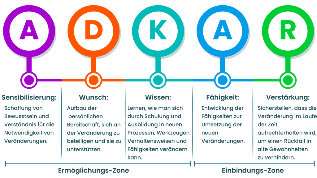 Das ADKAR-Modell, das für Awareness (Bewusstsein), Desire (Wunsch), Knowledge (Wissen), Ability (Fähigkeit) und Reinforcement (Verstärkung) steht, konzentriert sich auf die Reise des Einzelnen durch den Wandel. Es hilft dabei, Bereiche zu identifizieren, in denen der Einzelne Schwierigkeiten hat, und bietet gezielte Interventionen.