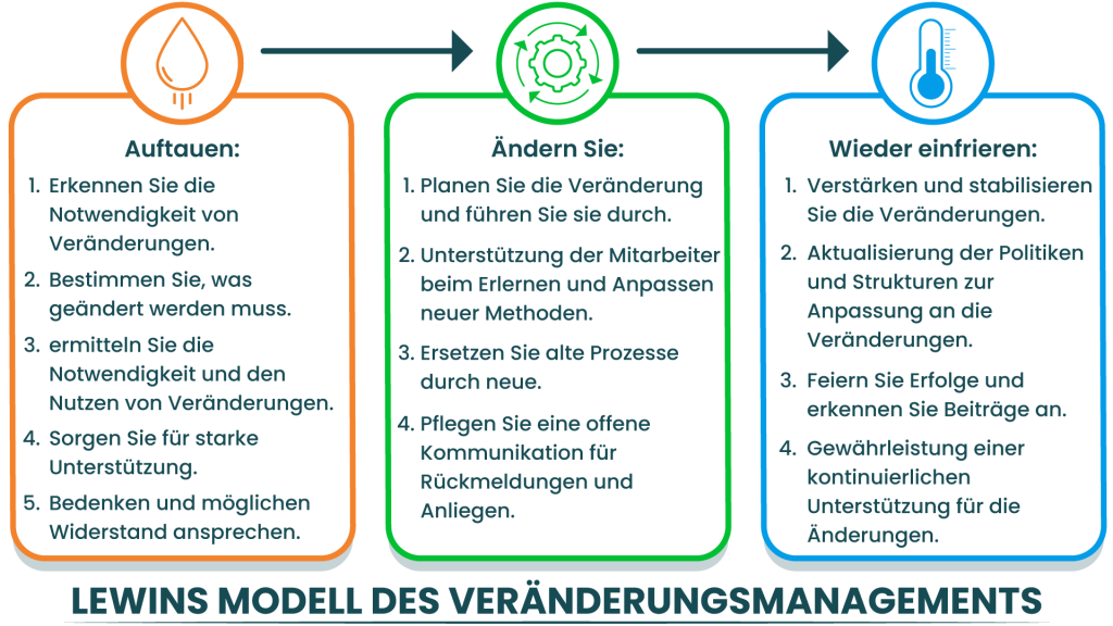 Das Modell von Kurt Lewin wird häufig als ein dreistufiger Prozess dargestellt: Auftauen, Verändern und Wiedereinfrieren. Es betont, wie wichtig es ist, Menschen auf Veränderungen vorzubereiten, sie umzusetzen und sie zu stabilisieren.