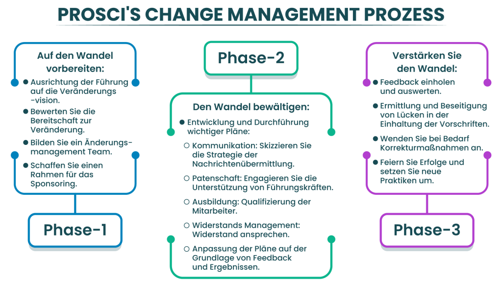 Der Ansatz von Prosci ist forschungsbasiert und umfasst drei Phasen: Vorbereitung auf den Wandel, Management des Wandels und Verstärkung des Wandels. Er unterstreicht die Bedeutung des Managements der “menschlichen” Seite des Wandels.